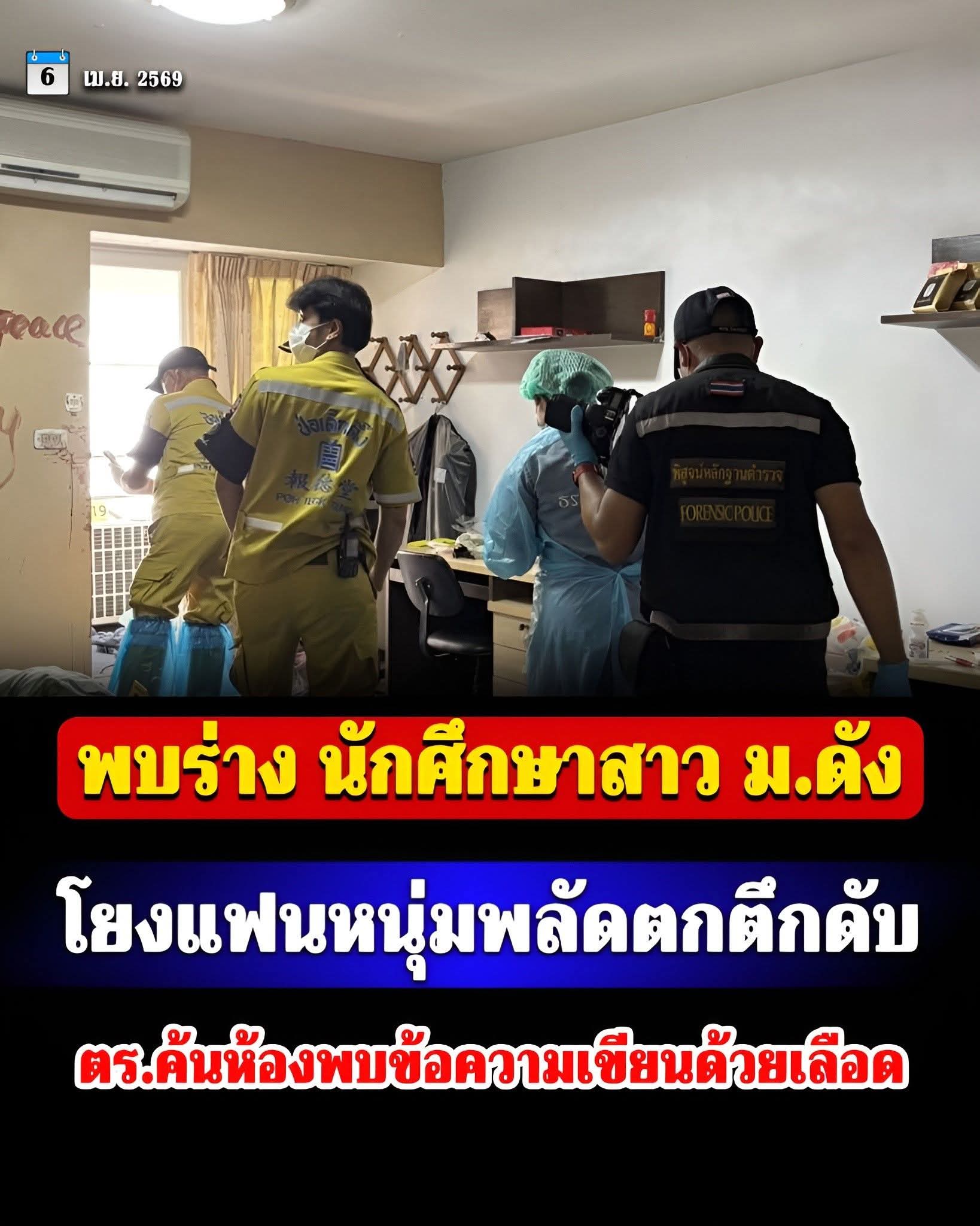 พบร่าง นักศึกษาสาว ม.ดัง ในหอพัก โยงแฟนหนุ่มพลัดตกตึกเสียชีวิต ตร.ค้นห้องพบข้อความเขียนด้วยเลือด