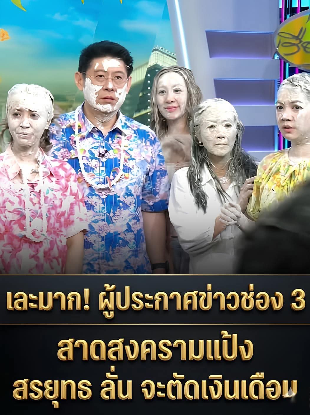 โดยก่อนจะเล่นน้ำสงกรานต์ ไล่ประแป้งกันจนกลายเป็นจลาจลในสตูดิโอรายการ กระทั่ง สรยุทธ ถึงกับลั่น ขอร้องห้องส่งเลอะ ออกไปข้างนอกไม่เอา ใครเข้ามาตัดเงินเดือน